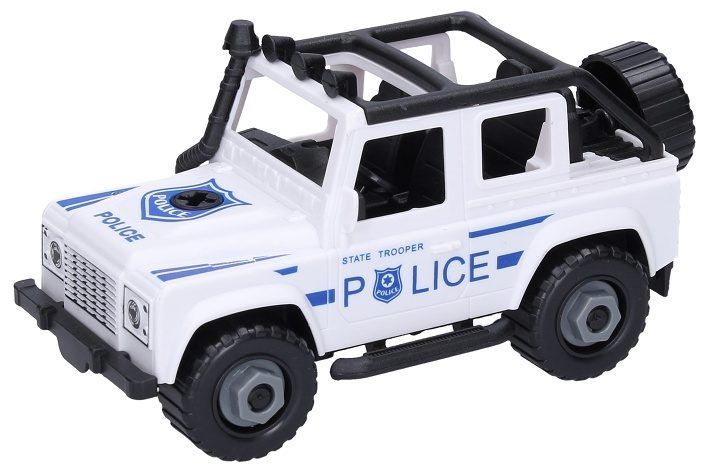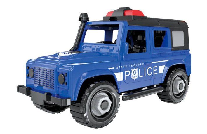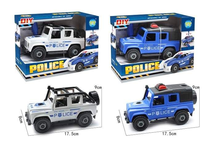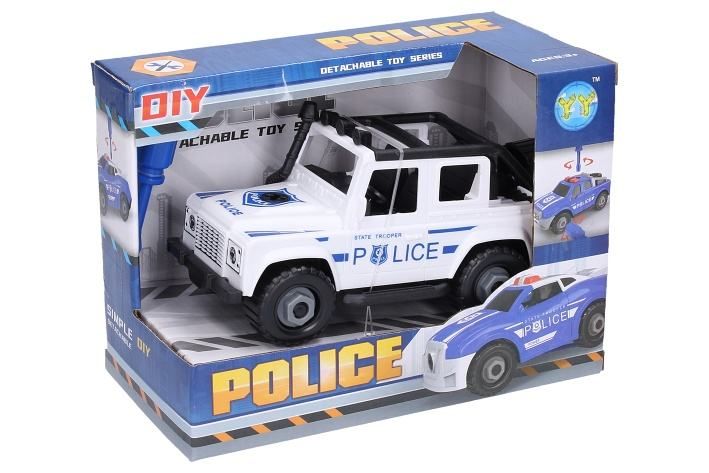Auto džíp policie šroubovací. Volná kola. Balení obsahuje auto a křížový šroubovák. V rukojeti šroubováku je klíč na matice. Rozměry 17,5x8x9x cm.