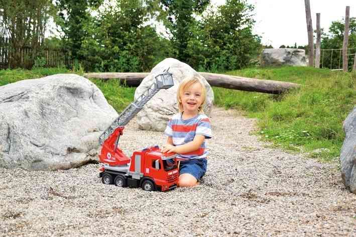 Mercedes Arocs hasič. 6mm tlusté kovové osky u kol. Funkční požární stříkačka s dostřikem až 3m. 250ml integrovaná nádobka na zásobu vody. Možnost otáčení s žebříkem v 270stupňů. Výsuv žebříku 60cm. Baleno v hnědém přepravním kartónu