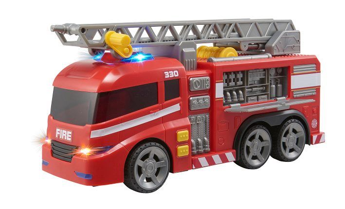 Auto hasičské s žebříkem. Velikost 37 cm. Vysouvací žebřík na kličku. Se světelnými a zvukovými efekty. Volná kola. 3xAAA baterie v balení.