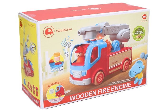 Auto hasičské dřevo/plast s efekty. Velikost 25cm. Světelné a zvukové efekty. Baterie 3xAG13 součástí. Provázek na tahání auta.
