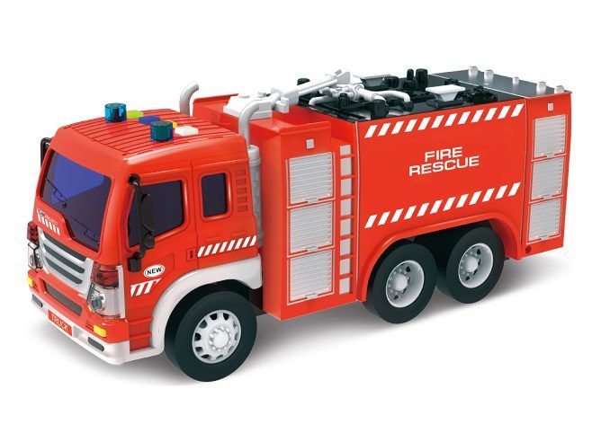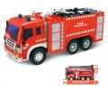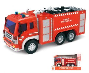 Auto hasičské se stříkačkou a efekty. Velikost 28 cm. Na setrvačník. Světelné a zvukové efekty - tlačítka na kabině. 3xAG13 baterie součástí.