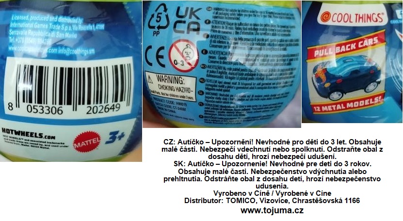 Krabička/kapsle/koule s překvapením obsahující kovové autíčko Hot Wheels GT, 65mm, autíčko má pohon na pull-back, 12 druhů