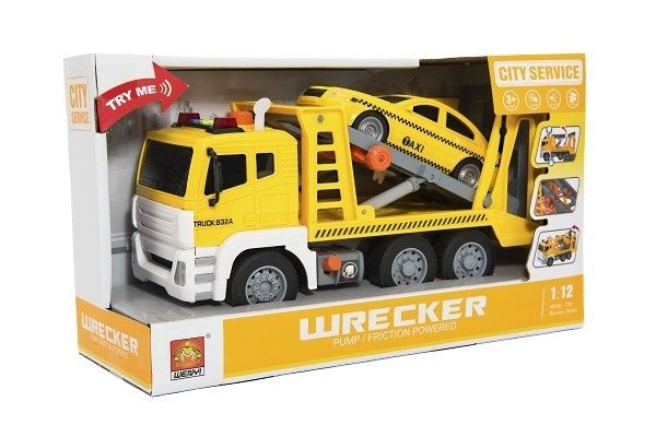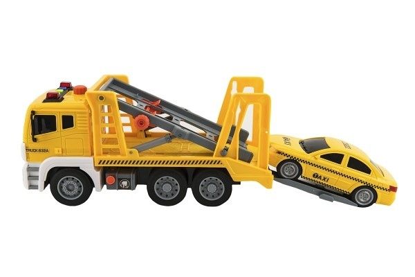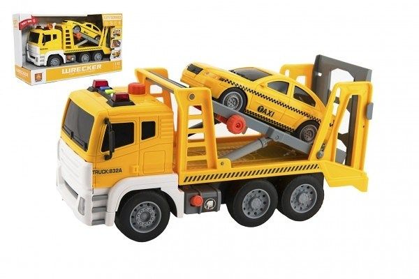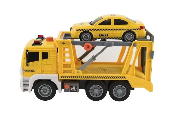 Auto kamion přepravník+1 auto plast na setrvačník na bat. se zvukem se světlem v krabici
