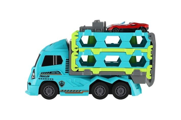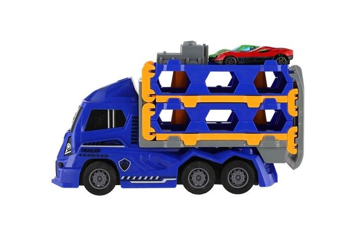 Kamion s autíčky pro malé řidiče. Parádní plastový kamion, který slouží jako přepravník pro závodní auta. Součástí balení jsou 2 sportovní autíčka a délka auta je 22 cm. Vozidlo je vybaveno setrvačníkem, díky kterému se po natažení rozjede. Skvělá hračka pro všechny děti, které milují kamiony a závodní auta. Vhodné pro hru doma i venku.