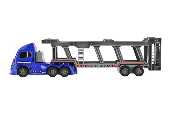 Vydej se na policejní zásah s parádním kamionem přepravníkem! Tento velký plastový tahač s realistickým designem a pohonem na setrvačník přepravuje tři různá policejní autíčka, která lze snadno vyjímat a znovu nakládat díky funkční rampě. Dvoupatrový návěs je výklopný a zajišťuje skvělou hratelnost i prostor pro uložení vozidel.
