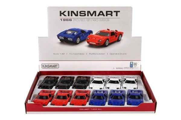 Krásný kovový model auta Ford GT40 MKII v měřítku 1:32. Autíčko má otevírací dveře a je na zpětné natažení. Dostupné ve čtyřech barevných variantách.