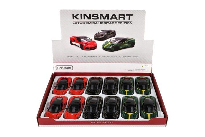 Krásný kovový model auta Lotus Emira 1:38. Autíčko má otevírací dveře a je na zpětné natažení. Dostupné ve třech barevných variantách.