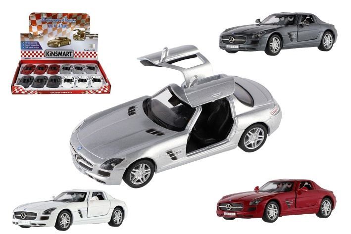 Krásný kovový model auta Mercedes-Benz SLS AMG v měřítku 1:36. Autíčko má otevírací dveře a je na zpětné natažení. Dostupné ve čtyřech barevných variantách.