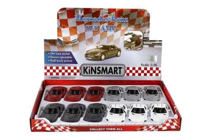 Krásný kovový model auta Mercedes-Benz SLS AMG v měřítku 1:36. Autíčko má otevírací dveře a je na zpětné natažení. Dostupné ve čtyřech barevných variantách.