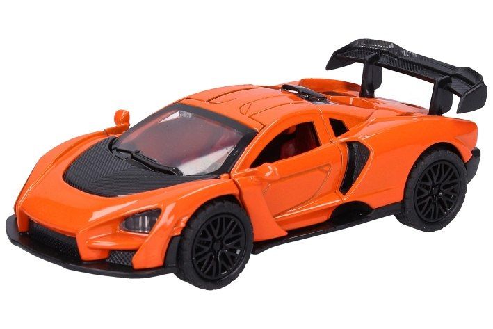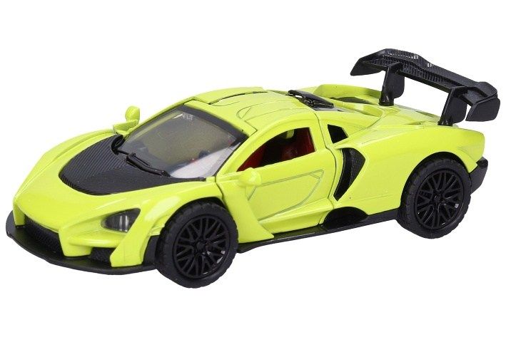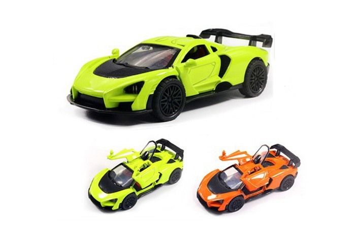 Auto kovové. Rozměry 12x5x3 cm. Na zpětné natažení. Otevírací dveře a zadní okno. 2 varianty - zelená, oranžová.