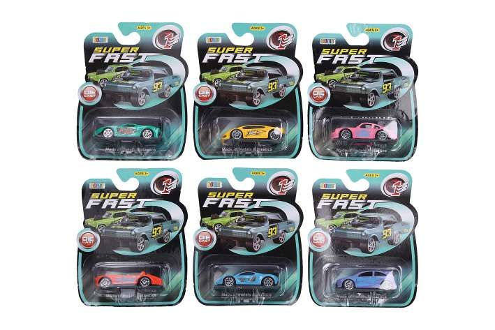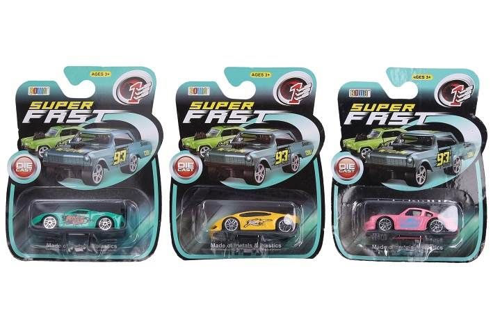 Auto kovové. Velikost 7,5 cm. Volná kola. 6 variant - modrá, zelená, žlutá, červená, růžová, fialová.