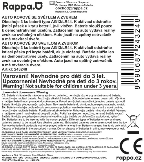 Kovové autíčko s otevíracími dveřmi, při zatlačením na auto, vydává různé zvuky a svítí. Auto jezdí na zpětný setrvačník. Obsahuje 3 ks baterií typu AG13/LR44.