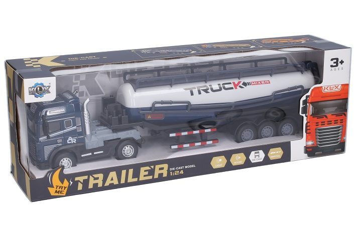 Auto kovové tahač cisterna na setrvačník s efekty. Délka 40 cm. Na setrvačník. Vydává světelné a zvukové efekty. Aktivace pohybem předních kol. Páčka na uzamčení návěsu. Návěs je možné odpojit. Baterie 3xAG13, součástí balení.