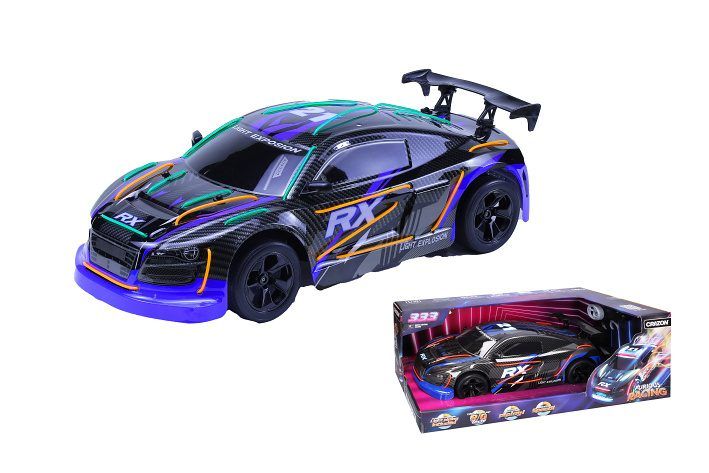 Auto Light Explosion RC na dálkové ovládání. Rozměry 44x19x14 cm. Frekvence 2. 4GHz. Pistolový ovladač. Rychlost 15 km/h. Světelné efekty, přepínání módů tlačítkem na ovladači. 7. 4V 500mAh bateriový pack do auta součástí, 2xAA do ovladače není součástí. USB kabel součástí.