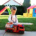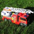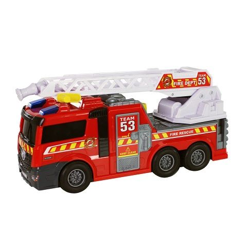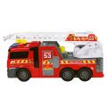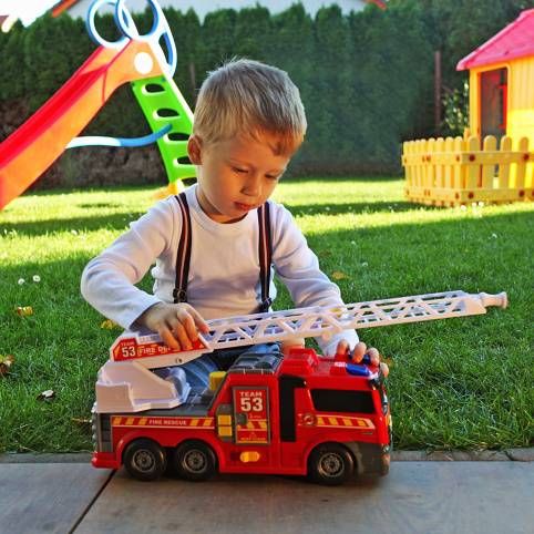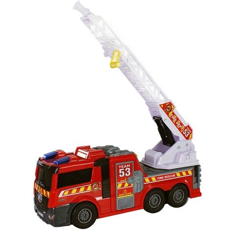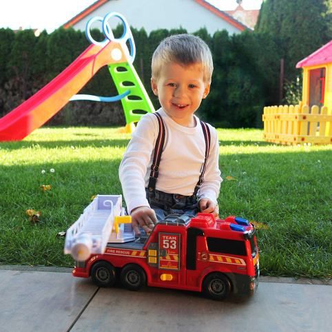 S tímto parádním hasičským autem přijedeš na záchrannou akci určitě včas! Nastartuj, zapni majáky, naplň nádrž vodou a můžeš vyrazit. Autíčko je dlouhé 36 cm a jezdí na volný chod. Po vložení 2 ks baterií typu AAA (nejsou součástí) autíčko vydává reálné zvuky a bliká.