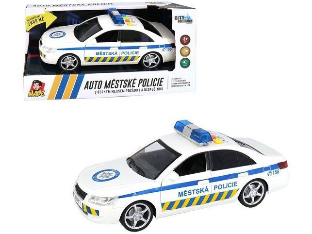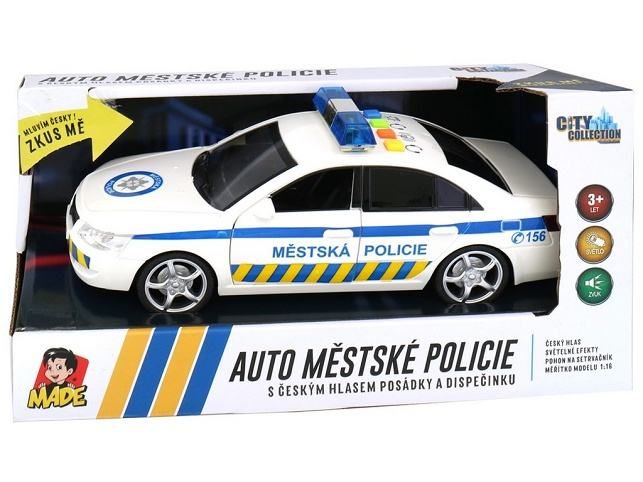 Auto v českém designu městské policie s českým hlasem posádky a dispečinku (+ funkční maják). DISPEČINK: Všem hlídkám, všem hlídkám. Hlášeno přepadení banky na ulici Nádražní. POSÁDKA: Sledujeme podezřelé osoby u obchodního střediska. Žádáme o posily a povolení k zásahu. DISPEČINK: Posíláme na místo další hlídky. Zásah povolen. Zvuk a světlo majáku. Napájení 3 x 1,5V AG13. Velikost auta 24 x 10 x 9 cm. Český box má rozměry 29 x 12 x 14 cm. Věk 3+