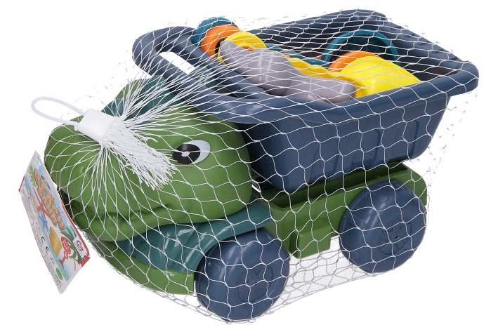 Auto na písek dino sklápěcí. Délka 27 cm. Se sklápěcí korbou. Obsah balení - auto, sítko 2x lopatka, 2x formička. Volná kola.