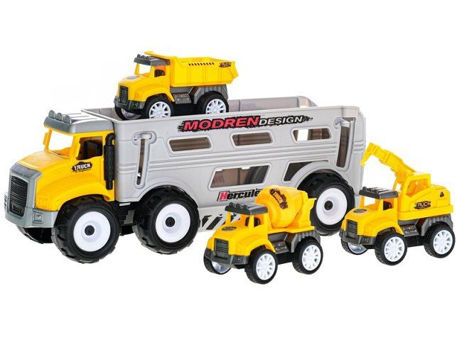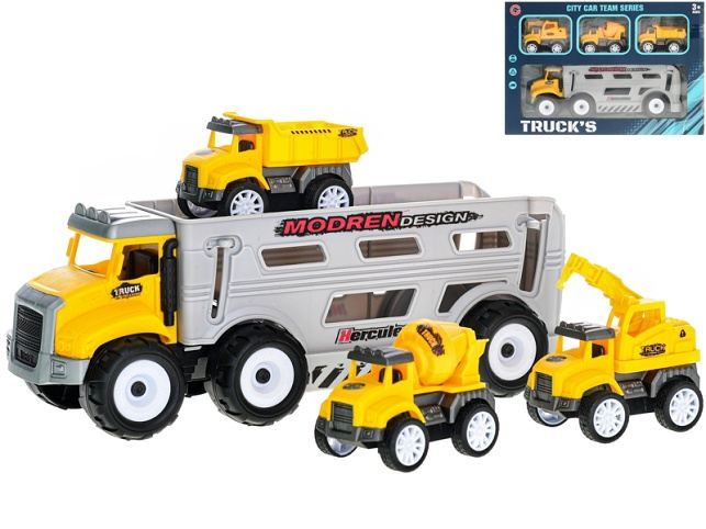 Auto nákladní 23cm na setrvačník + 3 stavební vozidla 7,5cm na zpětný chod v krabičce