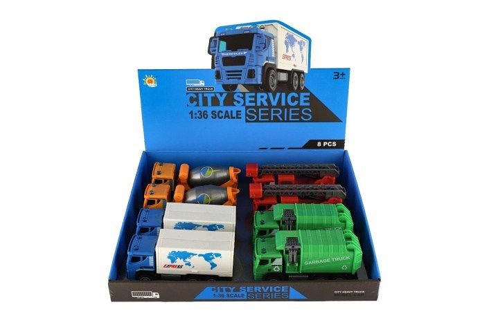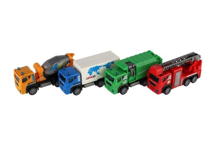 Vybrat si můžete ze 4 druhů aut, ať už stavební, nákladní nebo převozní. Auto je na zpětné natažení velikosti 15 cm.