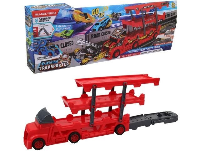 Auto nákladní, přepravní, 6 aut, 45 cm. Auto nákladní přepravní nedisponuje pouze převozním prostorem pro tvá auta ale ukrývá i skvělou závodní dráhou. Dráha je o délce 45 cm a pro své závodníky připraví pořádnou dávku napětí a adrenalinu. Celý set obsahuje i šest autíček kov/plast. Tak neváhej. Vysuň skládací dráhu a závody můžou začít. Materiál: plast, kov. Rozměr balení: 40 x 7,5 x 15 cm. Doporučený věk: 3+