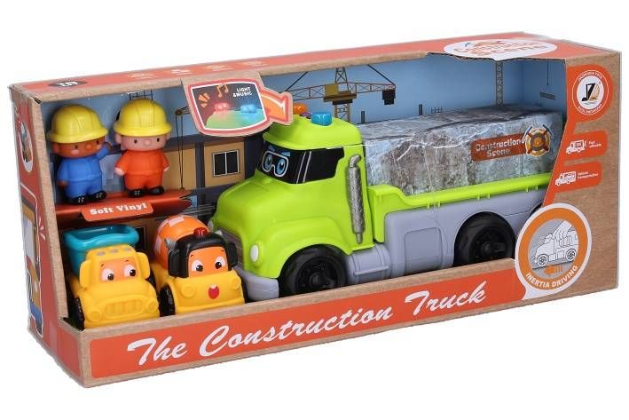 Auto nákladní set 4ks. velikost auta 26cm. Obsahuje velké auto, 2malé auta 7cm, 2 panáčky. Světelné a zvukové efekty (melodie, motor, maják). Setrvačník. Baterie 3xAG13 součástí.