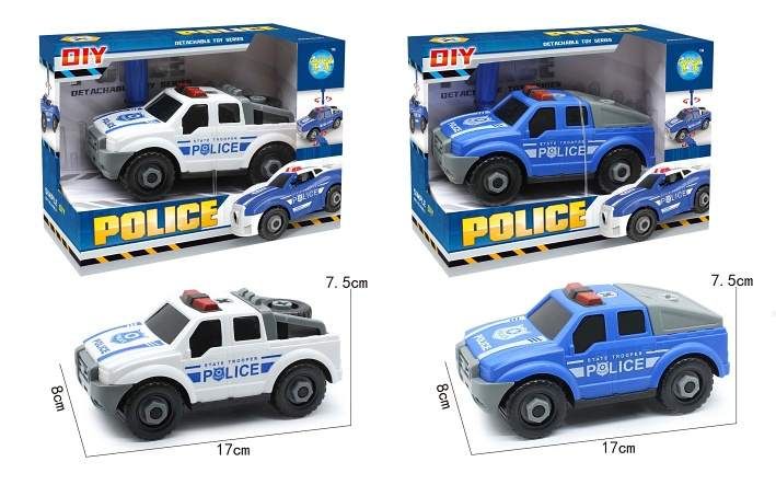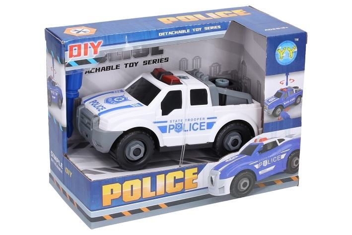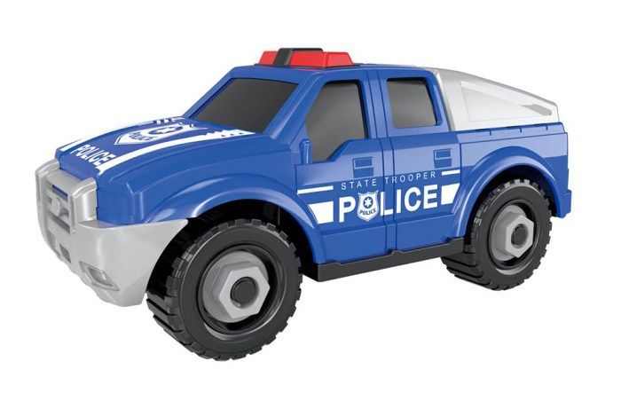 Auto pick-up policie šroubovací. Rozměry 17x8x7,5 cm. Volná kola. Balení obsahuje auto a křížový šroubovák. V rukojeti šroubováku je klíč na matice. 2 varianty - bílá, modrá.
