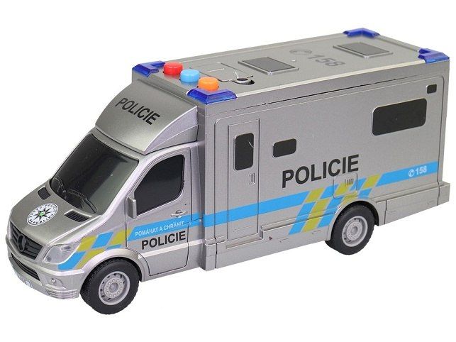 Auto policejní 19,5 cm, světlo, zvuk, na baterie. Policejní auto s českým hlasem posádky a dispečinku. Vůz jezdí na setrvačník a je vybaven funkčním majákem s modrými výstražnými světly a hlasem posádky vozu a dispečinku. Má otevírací dveře. Měřítko modelu 1:16, délka auta 19,5 cm. DISPEČINK: ,,Všem hlídkám, všem hlídkám. Hlášeno přepadení banky na ulici Nádražní. '' POSÁDKA: ,,Sledujeme podezřelé osoby u obchodního střediska. Žádáme o posily a povolení k zásahu. '' DISPEČINK: ,,Posíláme na místo další hlídky. Zásah povolen. " Zvuk a světlo majáku. Hračka je určena pro děti 3+. Rozměr hračky je 19,5 x 6,5 x 8,5 cm. Materiál hračky je plast. Balení hračky je open box. Produkt je určený pro kluky. Ke zprovoznění produktu jsou potřeba 3 AG13 baterie. Baterie jsou součástí balení.