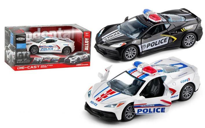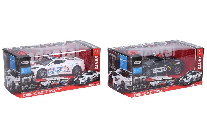 Auto policejní kovové. Rozměry 12x5,3x3,8 cm. Na zpětné natažení. Otevírací dveře. 2 varianty - černá, bílá.