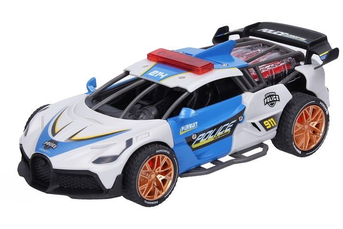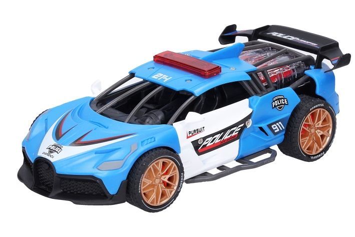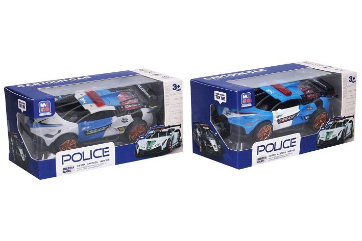 Auto policejní s efekty. Rozměry 18x8,8x6 cm. Na setrvačník. Světelné a zvukové efekty motoru stlačením přední kapoty. 3xAG13 baterie součástí. 2 varianty - modré, šedé.