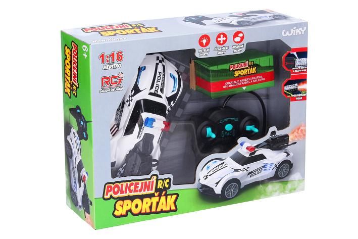 Auto policejní svítící s kouřovými efekty RC na dálkové ovládání. Velikost 18 cm. Frekvence 40 MHz. Světelné a kouřové efekty. Bateriový pack 3. 7V Li-ion do auta součástí, 2xAA do ovladače nejsou součástí. USB kabel součástí. Nádržka na vodu na křídle. Nádobka na vodu součástí. Přepínač ON/OFF na spodní straně auta. Tlačítko mezi páčkami na ovladači - kouřové efekty.