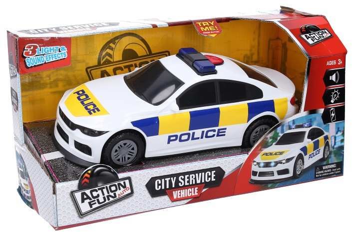 Auto policie na setrvačník s efekty. Velikost 32 cm. Světelné a zvukové efekty, aktivace tlačítkem na střeše. Pohon na setrvačník.
