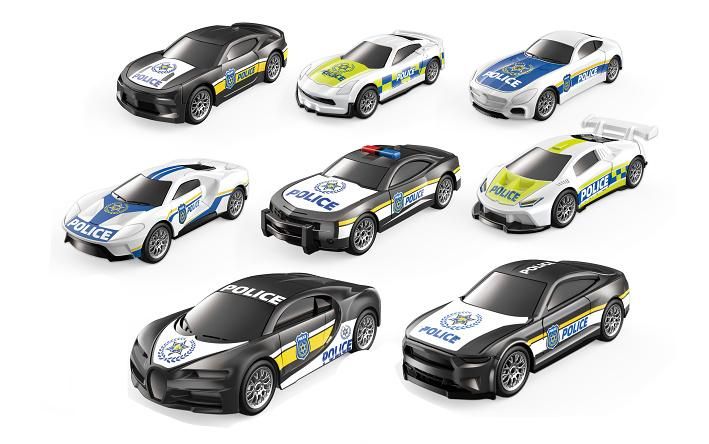 Auto policie na zpětné natažení. Rozměry 7,3x1,7x2,5 cm. Balení obsahuje 4 ks. 8 variant.