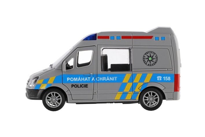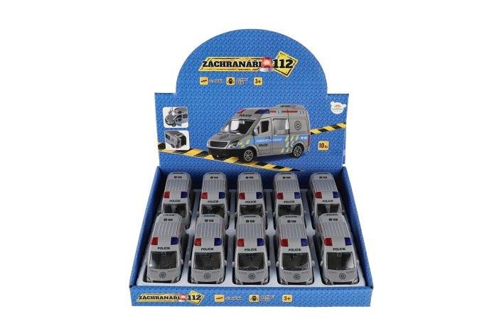 Policejní zásah může začít. Plastové policejní auto o délce 12 cm je vybaveno setrvačníkovým pohonem – stačí natáhnout dozadu a vozidlo se samo rozjede vpřed.