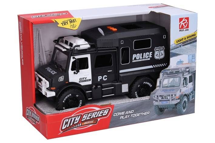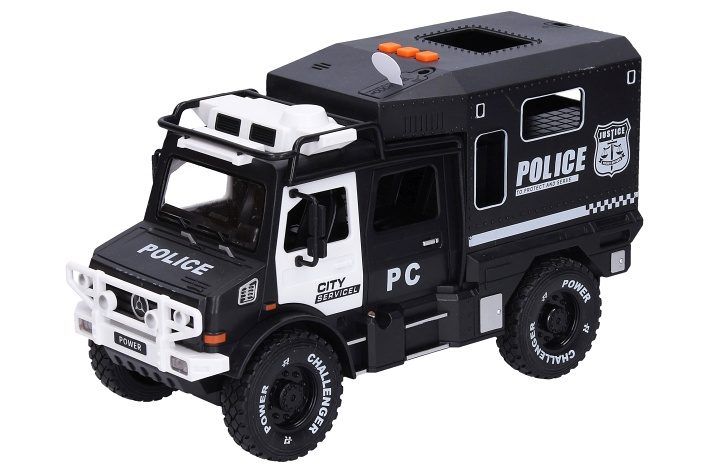 Auto policie s efekty. Velikost 23cm. zvukové (zvuk motoru, couvání, maják) a světelné efekty. Baterie 3xAG13 součástí. Setrvačník.