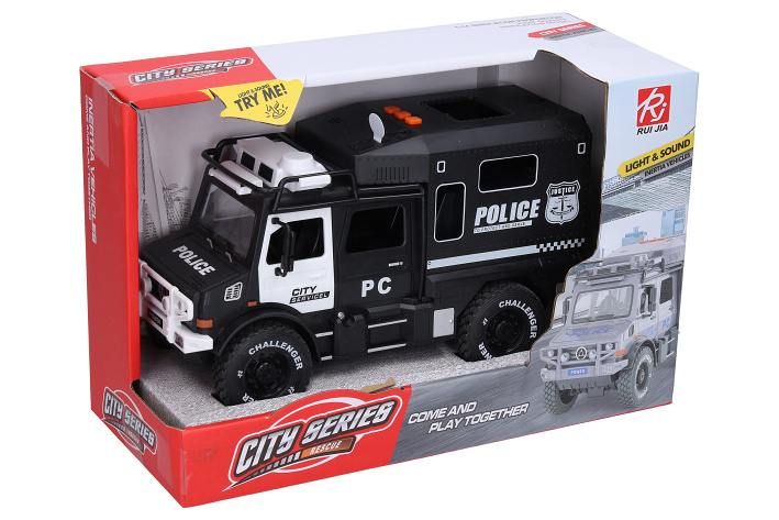 Auto policie s efekty. Velikost 23cm. zvukové (zvuk motoru, couvání, maják) a světelné efekty. Baterie 3xAG13 součástí. Setrvačník.