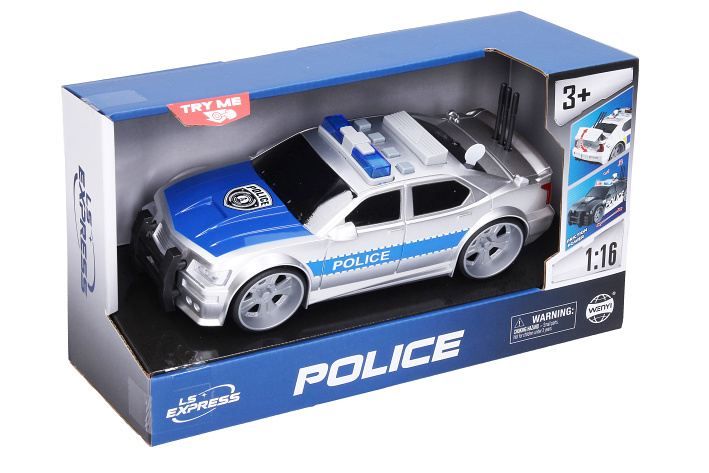 Auto policie s efekty na setrvačník. S otevíracím kufrem, otevírá se tlačítkem na střeše auta. Rozměry 27,2x9,1x11 cm. Vydává světelné a zvukové efekty, aktivace tlačítky na střeše (zvuk motoru, couvání, troubení, maják). Baterie 3xAG13, součástí balení.