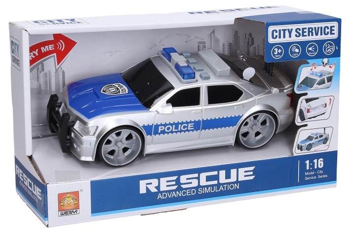 Auto policie s efekty na setrvačník. S otevíracím kufrem, otevírá se tlačítkem na střeše auta. Rozměry 27,2x9,1x11 cm. Vydává světelné a zvukové efekty, aktivace tlačítky na střeše (zvuk motoru, couvání, troubení, maják). Baterie 3xAG13, součástí balení.