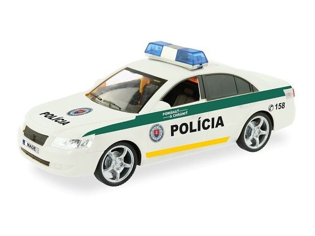 Auto ve slovenském designu policie se slovenským hlasem posádky a dispečinku (+ funkční maják). DISPEČINK: „Všetkým hliadkam, všetkým hliadkam. Hlásenie prepadnutia banky na ulici Železničná. “ Posádka: „Sledujeme podozrivé osoby pri obchodnom centre. Žiadame o posily a povolenie na zásah. “ Dispečink: „Posielame na miesto ďalšie hliadky. Zásah povolený. “ Zvuk a světlo majáku. Napájení 3 x 1,5V AG13. Velikost auta 24 x 10 x 9 cm. Slovenský box má rozměry 29 x 12 x 14 cm.