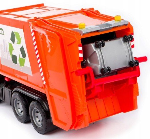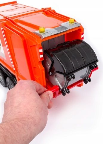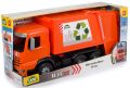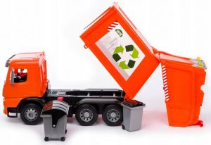 Auto Mercedes Arocs popelář. 6mm tlusté kovové osky u kol. Součástí je pojistka proti nežádoucímu vyklopení. 1x malá ,1x velká popelnice.