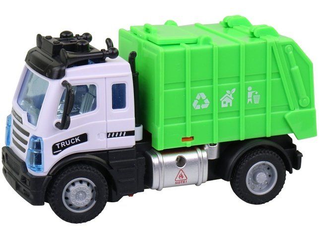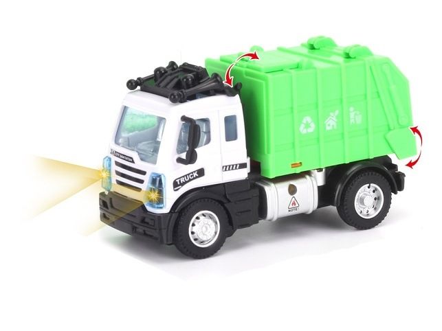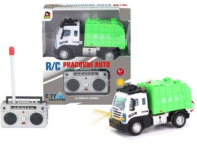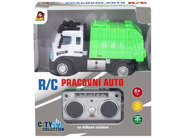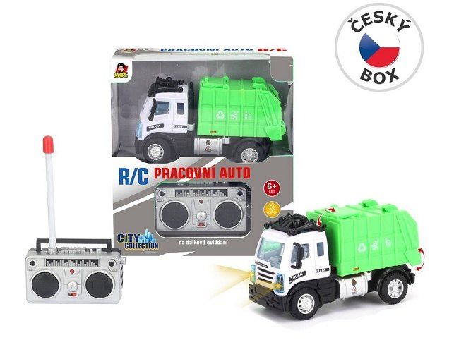 Popelářské auto s kontejnerem na dálkové ovládání z kolekce City collection. Ovladač v designu přenosného radiomagnetofonu. Auto jezdí dopředu, dozadu, vlevo a vpravo. Český box. Měřítko 1:64. Vhodné pro děti od 6 let. Světelné efekty. Napájení auto: baterie 2 x 1,5 V AA (nejsou součástí balení), ovladač: baterie 2 x 1,5 V AA (nejsou součástí balení). Auto obsahuje na spodní straně páčku jemného vyladění pohybu. Jestliže se auto při jízdě vpřed vychyluje na jednu stranu, je možné touto páčkou směr seřídit. Rozměry balení: 19 x 16 x 6,5 cm.