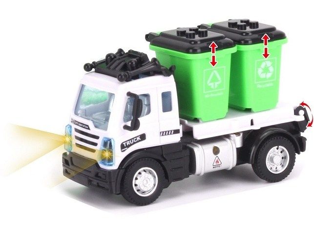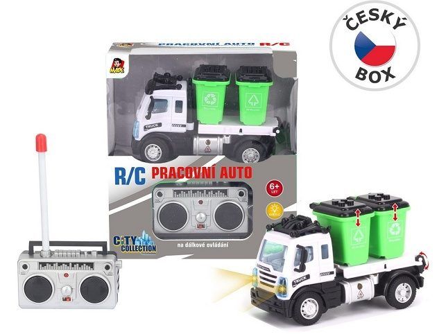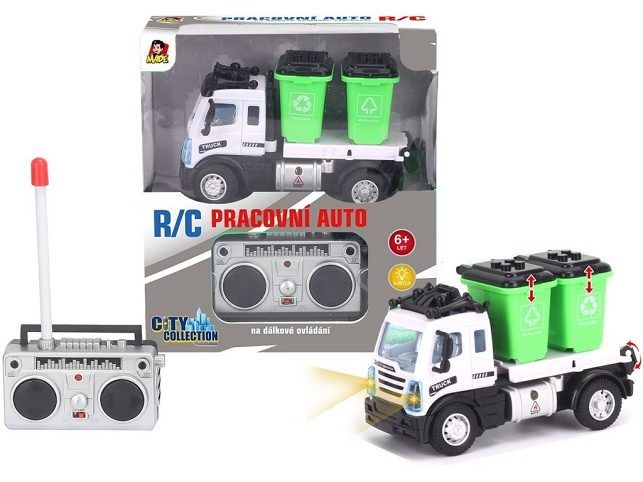 Každý malý kluk se chce povozit na popelářském autě. S tímto popelářským autem s kontejnery, na dálkové ovládání se můžou svému přání trochu přiblížit. Popelářské auto s kontejnerem na dálkové ovládání z kolekce City collection. Ovladač v designu přenosného radiomagnetofonu. Auto jezdí dopředu, dozadu, vlevo a vpravo. Český box. Měřítko 1:64. Vhodné pro děti od 6 let. Světelné efekty. Auto má na spodní straně páčku jemného vyladění pohybu. Jestliže se auto při jízdě vpřed vychyluje na jednu stranu, je možné touto páčkou směr seřídit. Rozměry balení: 19 x 16 x 6,5 cmRozměr hračky je 12 x 7 x 6 cm. Materiál hračky je plast. Balení hračky je window box. Napájení auta: 2 x 1,5 V AA baterie nejsou součástí balení. Napájení ovládání: 2 x 1,5 V AA baterie nejsou součástí balení.