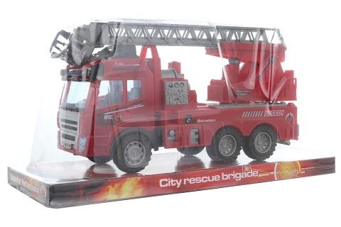 Plastové hasičské auto na setrvačník. Lze zvednout plošinu na autě. Rozměry auta cca 27,5 x 16 x 8 cm. Rozměry balení cca 36 x 19 x 13 cm. Věk 3+