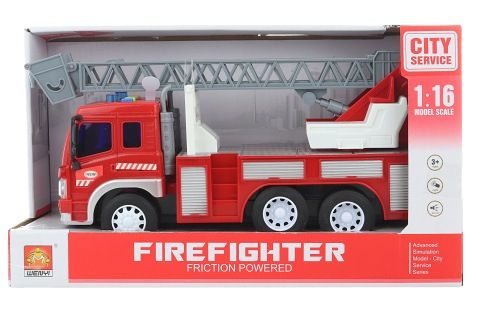 Hasičcké auto na baterie. Po stisknutí tlačítek na kapotě vydává zvuky a svítí. Rozměry auta cca 27 x 14 cm. Rozměry balení cca 32 x 18,5 x 12 cm. Napájení 3x AG13 (je součástí balení). Věk 3+
