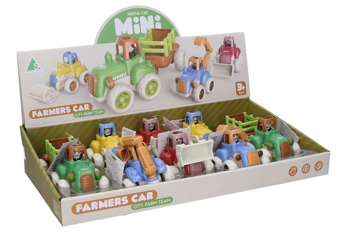 Auto pracovní stroje na setrvačník. Rozměry 16x7,5x7,5 cm. Display box 8ks. 4 varianty - válec, bagr, buldozer, traktor.