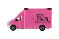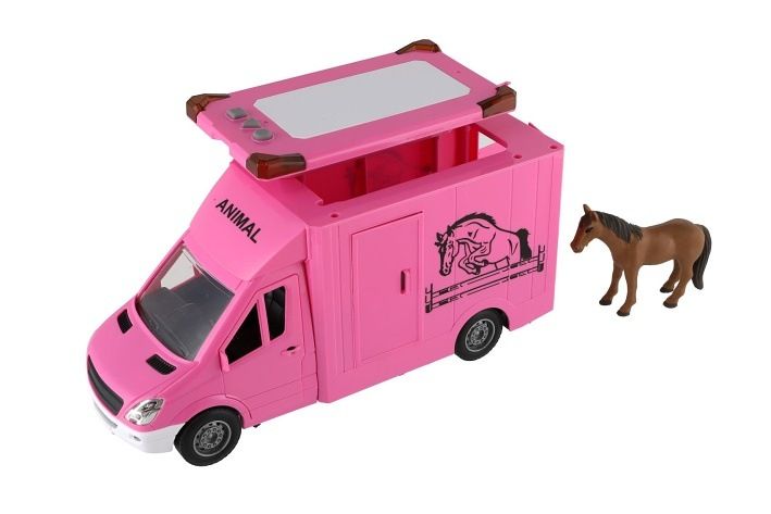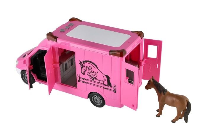 Auto pro převoz koní na setrvačník. Všechny dveře se dají otevřít. Součástí balení je postavička koně. Velikost auta je 28 cm a má světelné a zvukové efekty. 2x AA baterie jsou součástí balení.