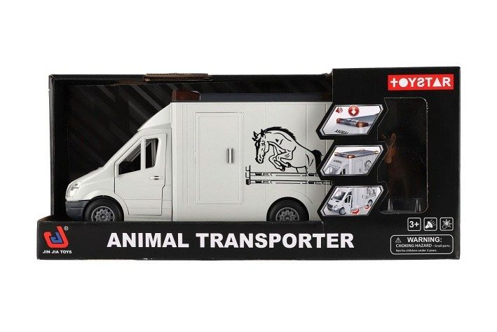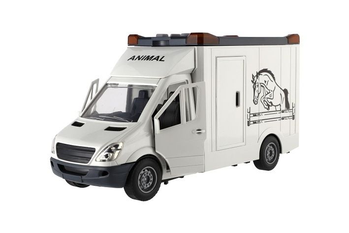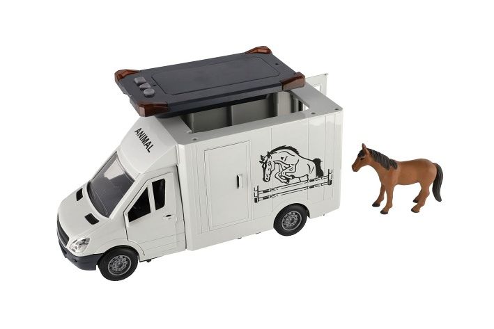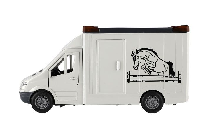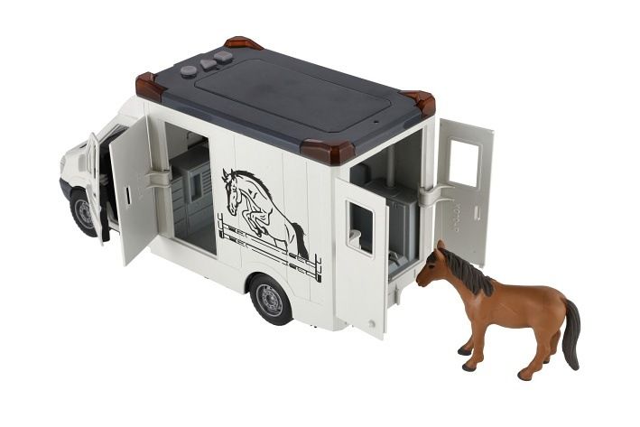 Auto pro převoz koní na setrvačník. Všechny dveře se dají otevřít. Součástí balení je postavička koně. Velikost auta je 28 cm a má světelné a zvukové efekty. 2x AA baterie jsou součástí balení.
