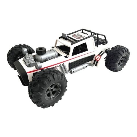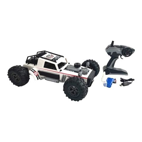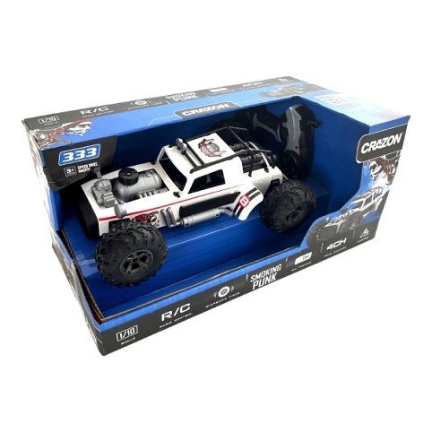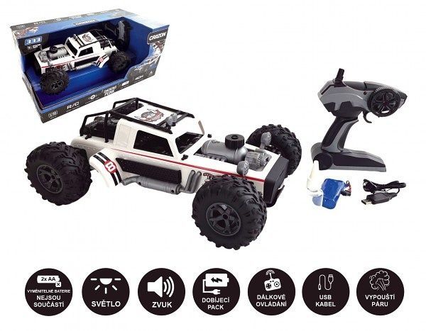 Bílé auto na ovládání s velkými pneumatikami, které umožňují jízdu téměř po kterémkoliv povrchu. Auto s funkcí výfukové páry. Dobíjení auta pomocí USB kabelu. Balení obsahuje dobíjecí pack (auto), baterie 2 x AA nejsou součástí balení (ovládání). Měřítko auta 1:12.
