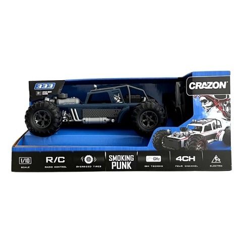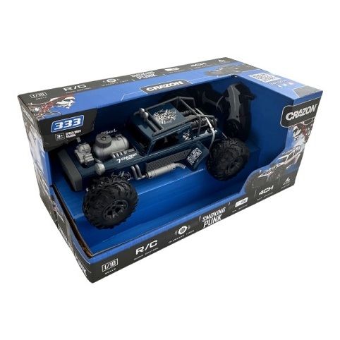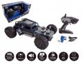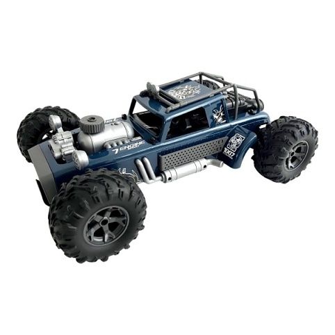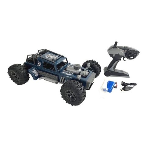 Modré auto na ovládání s velkými pneumatikami, které umožňují jízdu téměř po kterémkoliv povrchu. Auto s funkcí výfukové páry. Dobíjení auta pomocí USB kabelu. Balení obsahuje dobíjecí pack (auto), baterie 2 x AA nejsou součástí balení (ovládání). Měřítko auta 1:12.