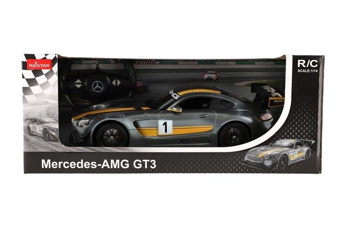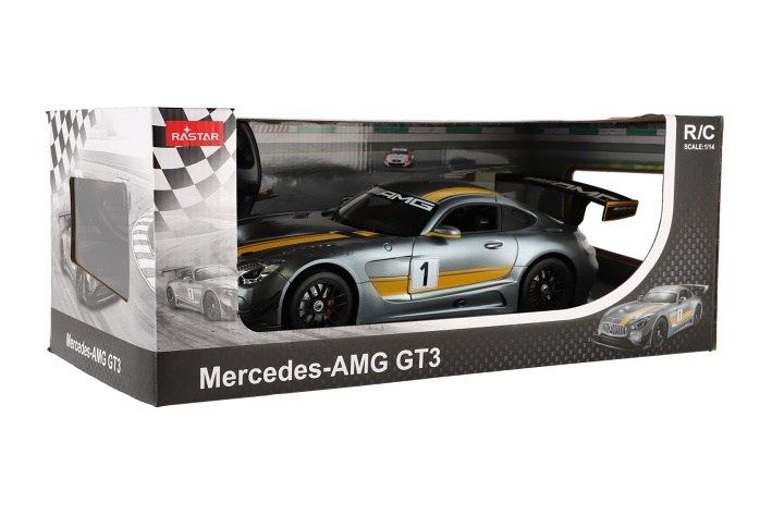 Krásný RC model auta Mercedes AMG GT3 v šedé barvě se žlutými pruhy. Jedná se o propracovaný model s plastovými doplňky. Auto je na dálkové ovládání ve tvaru sportovního volantu a dokáže se pohybovat do čtyř směrů - dopředu, dozadu, doprava a doleva. Frekvence je 2,4GHz. Měřítko je 1:14.