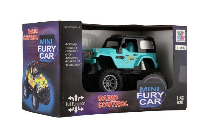 Auto RC terénní 14cm plast 27MHz na baterie se světlem tyrkysové v krabici 20x11x10cm